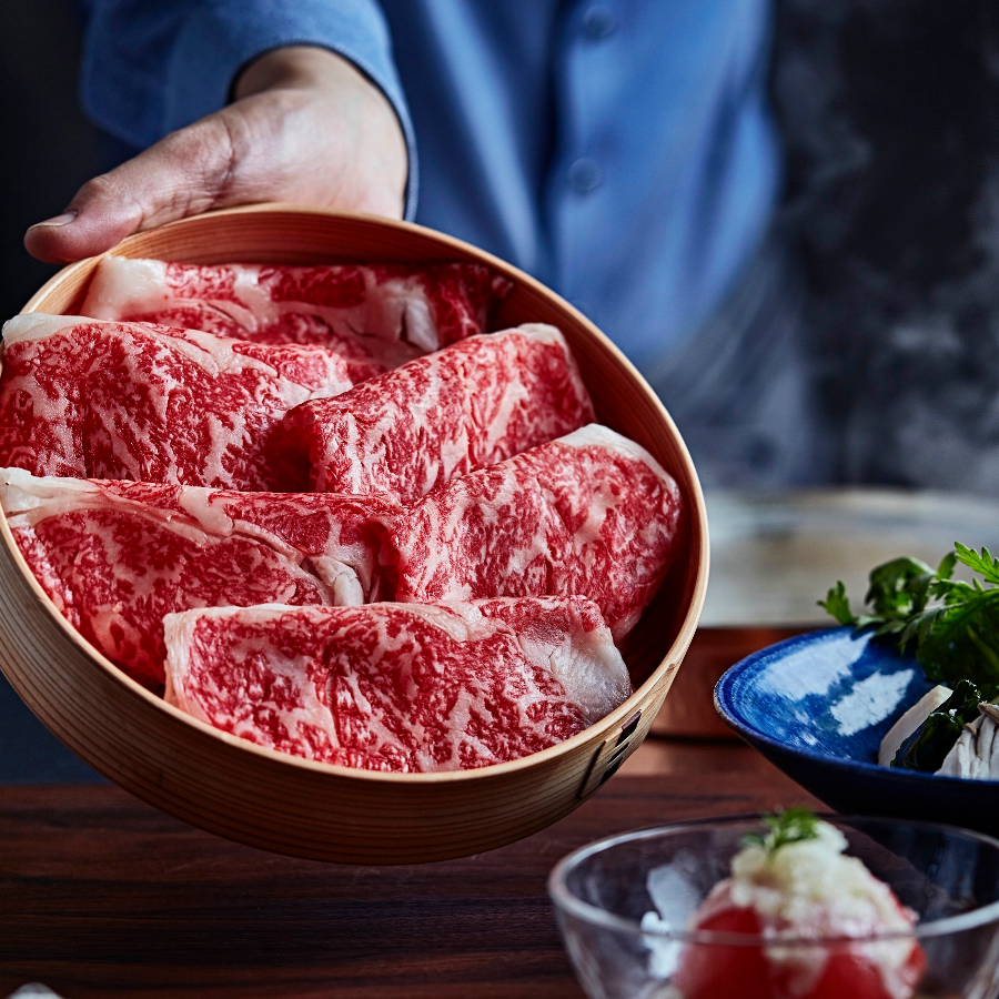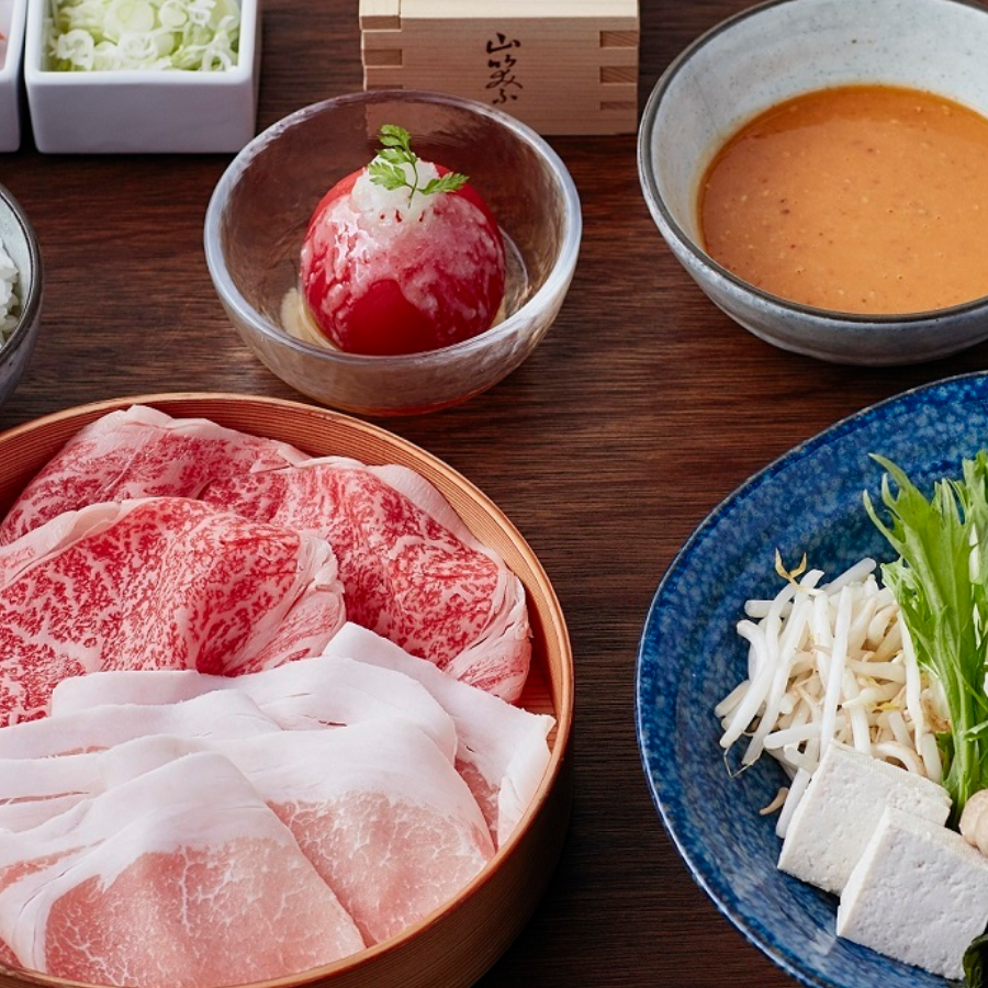 素材の味わいがダイレクトに感じられるしゃぶしゃぶだからこそ、食材は厳選に厳選を重ねました。 脂と赤身のバランスの良いロース肉に限定した山形牛や国産牛、やわらかで繊細な味わいのブランド豚「米澤豚一番育ち」、 しゃぶしゃぶと一緒にいただくご飯は、新潟県認証特別栽培米の長岡産コシイブキを使用しました。 その他、静岡産と鹿児島産の茶葉をバランスよくブレンドしたほうじ茶や煎茶、すき焼きに使用している卵など、 食材を熟知している専門業者たちと「協業」することで、最も良いコンディションの食材を取り揃えています。